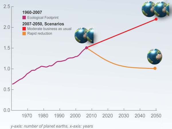 Come si può vedere dal grafico sottostante, il pianeta terra non dispone delle risorse naturali sufficienti a soddisfare la domanda secondo il modello di business attuale, bisognerà necessariamente evolvere verso modelli di business più efficienti dal punto di vista utilizzo delle risorse per garantire la sopravvivenza del nostro pianeta.